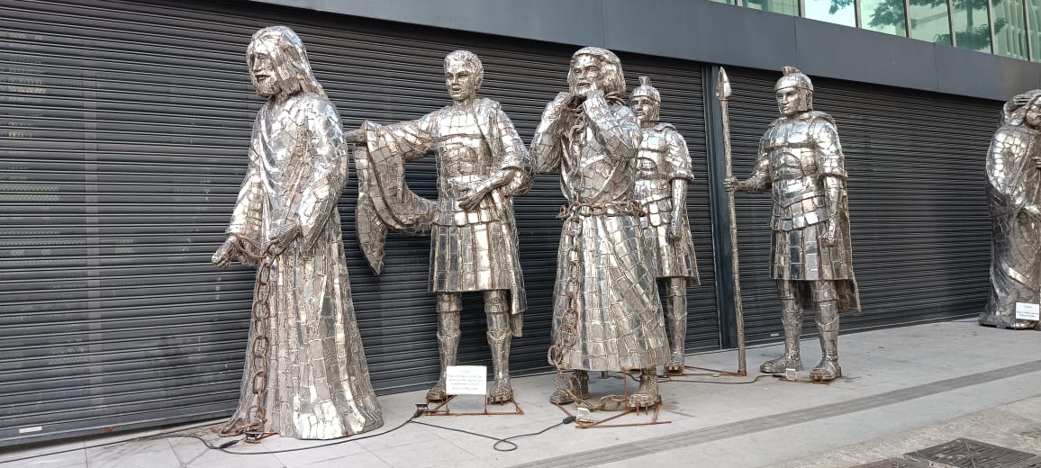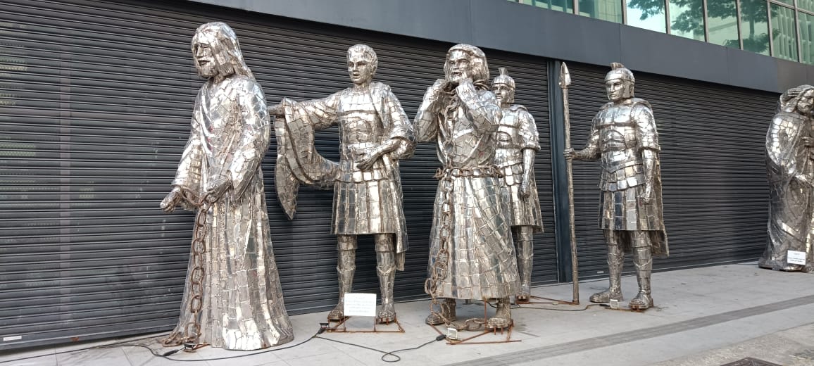 São 50 esculturas feitas em aço inox, distribuídas em 16 cenas, que retratam a vida de Jesus Cristo, desde o seu nascimento e batismo até sua crucificação e ressurreição.